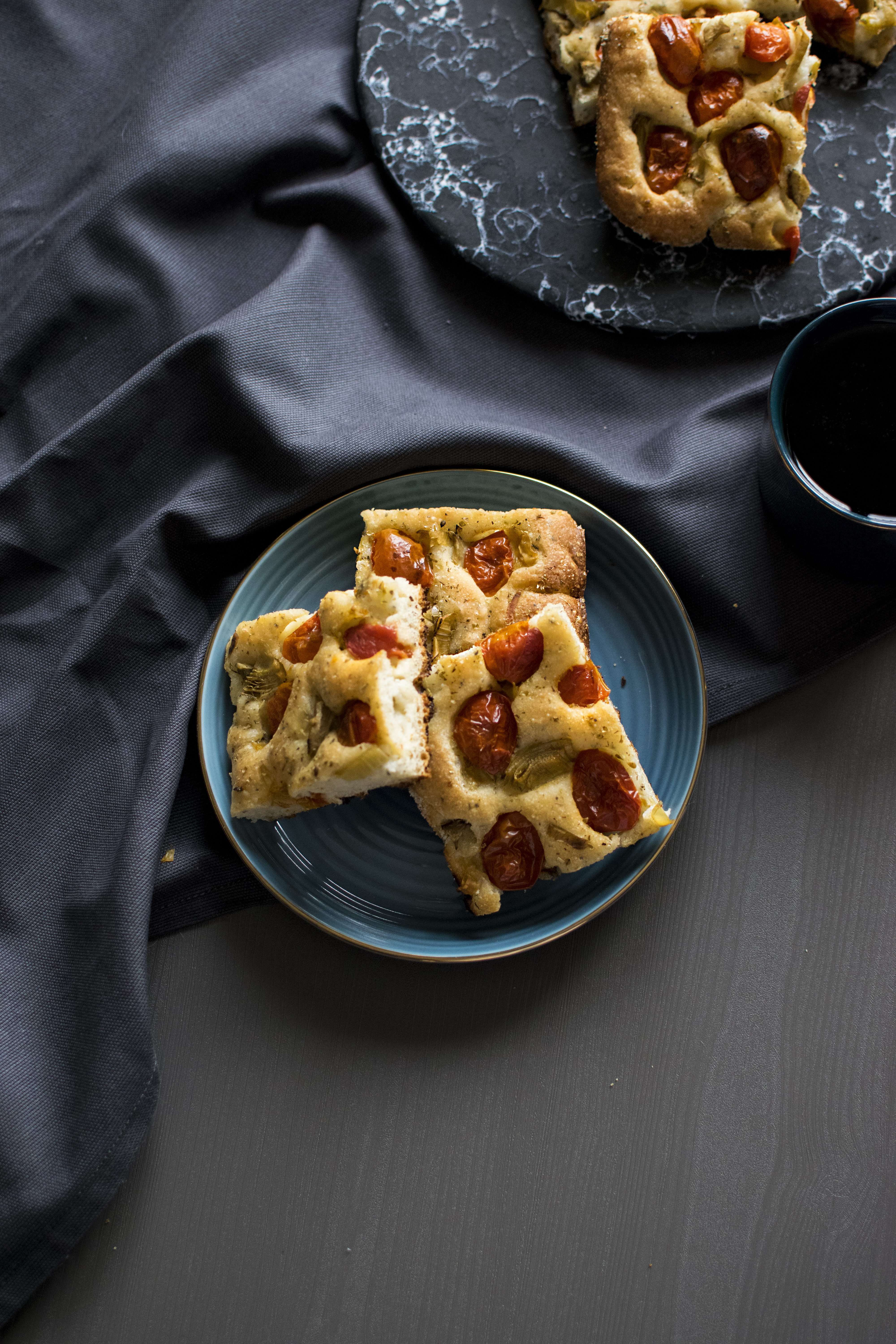 One of the main things that I try to do, the best that I can, is to make sure that I don’t let the food go to waste, so what I can repurpose in another dish, I will. This is what I do with cherry tomatoes, when I have just a few left, and I know I don’t have any use for them, I convert them into a foccacia. You can top foccacias with what you want or like, you can just sprinkle some herbs on top and/or a bit of salt. My favorite combination is tomatoes and artichokes, and if I have any, I may add a bit of pecorino.