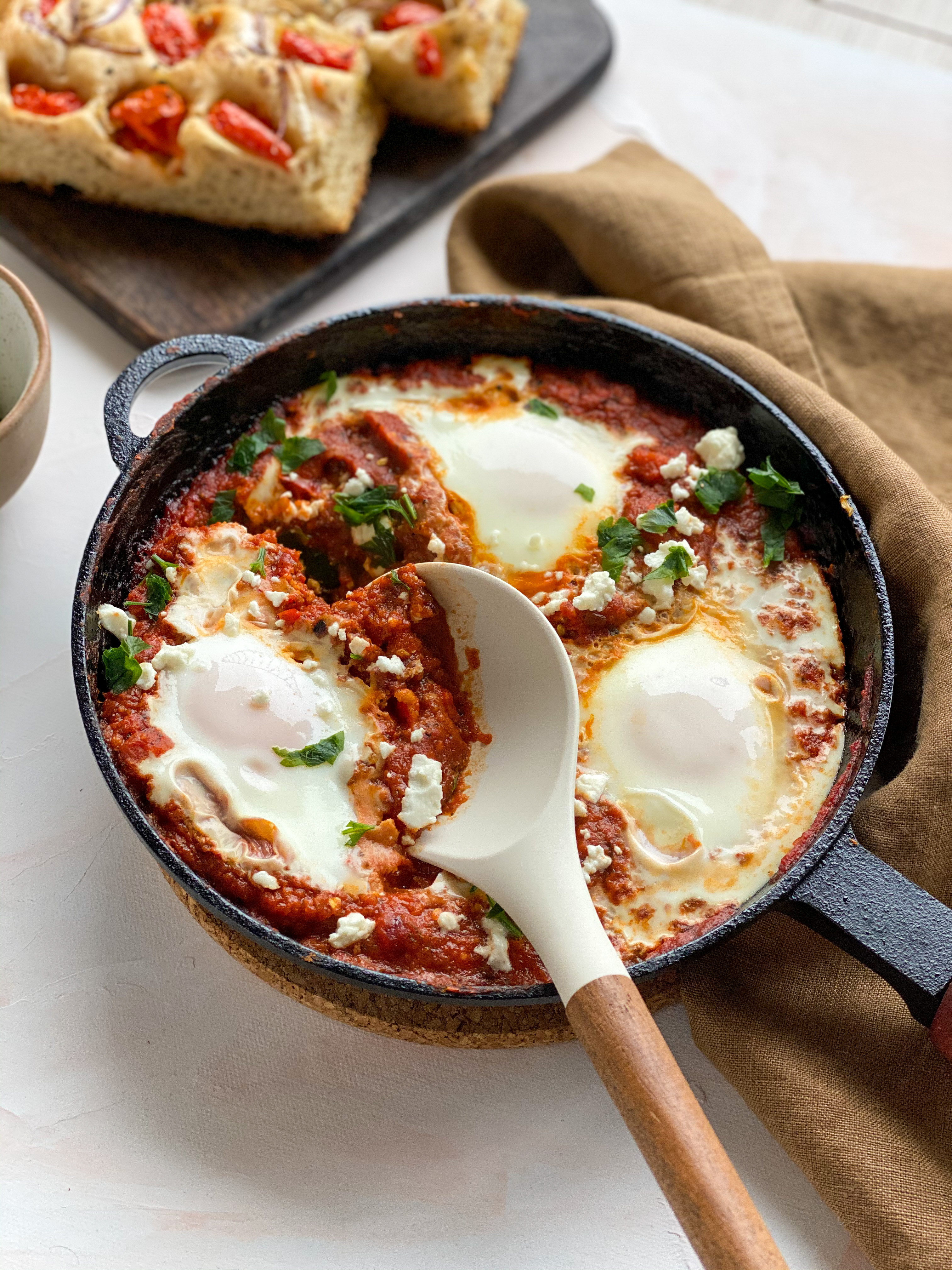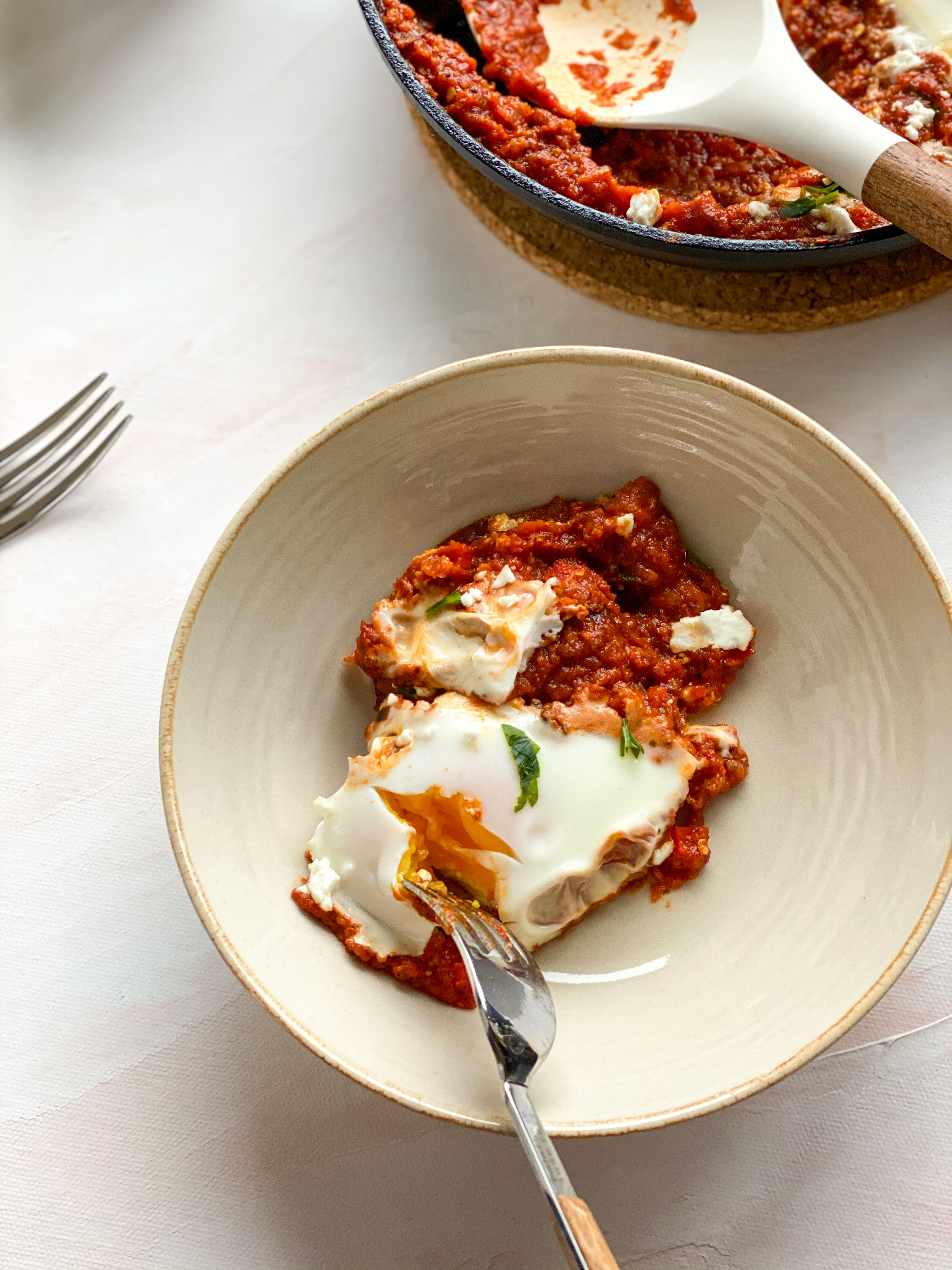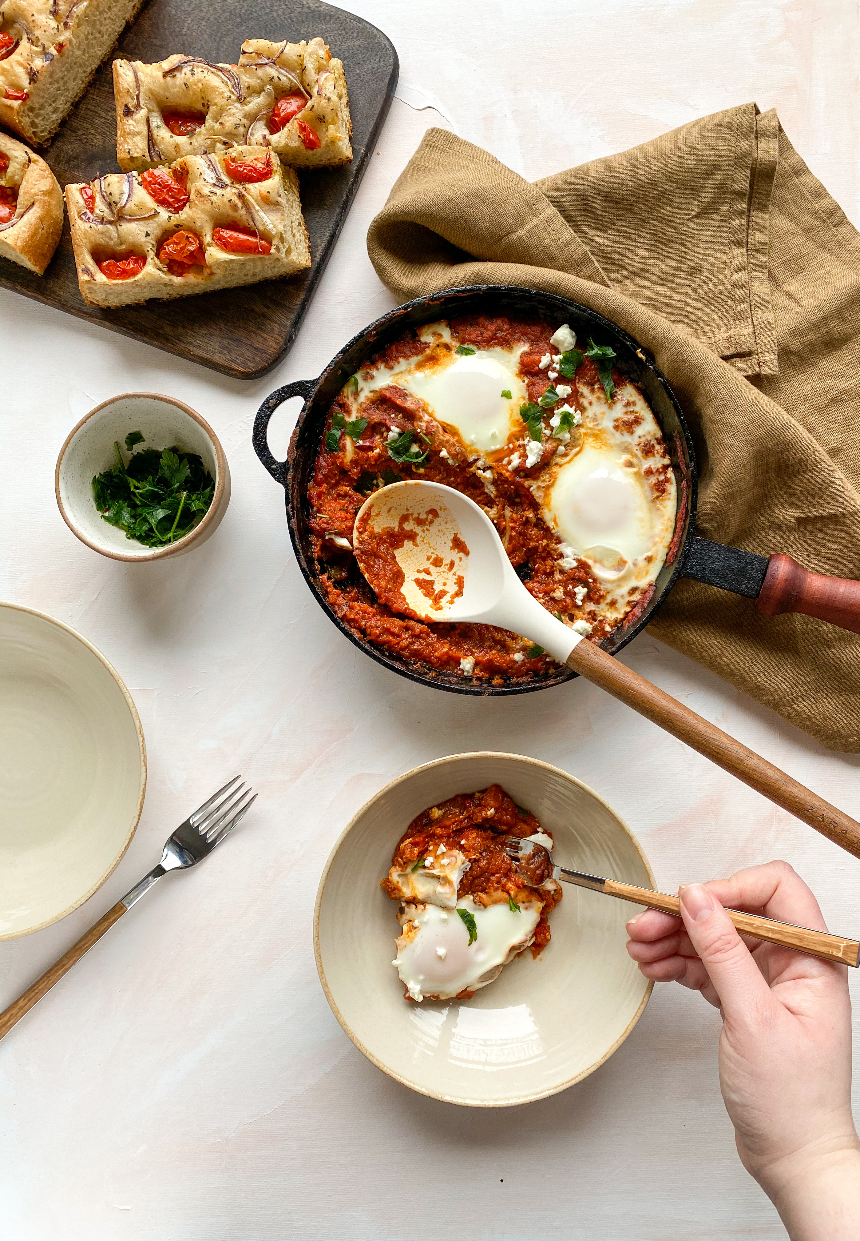 Shakshuka has become one of the staples in our house. It is a delicious dish, easy to adapt to what you have in the fridge and also pretty fast. It can be served as a breakfast, brunch, or at whatever meal you like, with a slice of sourdough bread, some feta or burrata, the combinations are endless.